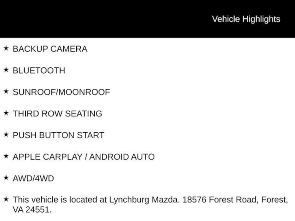 51k 2026 Mazda CX-90 3.3 Turbo Preferred AWD 8-Speed Automatic I6 Turbo BACKUP CAMERA, BLUETOOTH, SUNROOF/MOONROOF, THIRD ROW SEATING, PUSH BUTTON START, APPLE CARPLAY / ANDROID AUTO, AWD/4WD, This vehicle is located at Lynchburg Mazda. 18576 Forest Road, Forest, VA 24551., ABS brakes, Active Cruise Control, Alloy wheels, Compass, Electronic Stability Control, Front dual zone A/C, Heated door mirrors, Heated front seats, Heated rear seats, Heated/Ventilated Front Bucket Seats, Illuminated entry, Leather Seat Trim, Low tire pressure warning, Power Liftgate, Power moonroof, Remote keyless entry, Traction control.