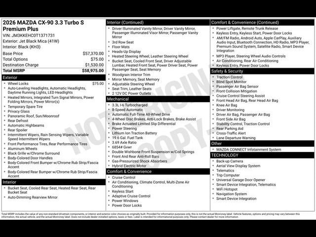 Jet Black Mica 2026 Mazda CX-90 3.3 Turbo S Premium Plus AWD 8-Speed Automatic I6 Turbo